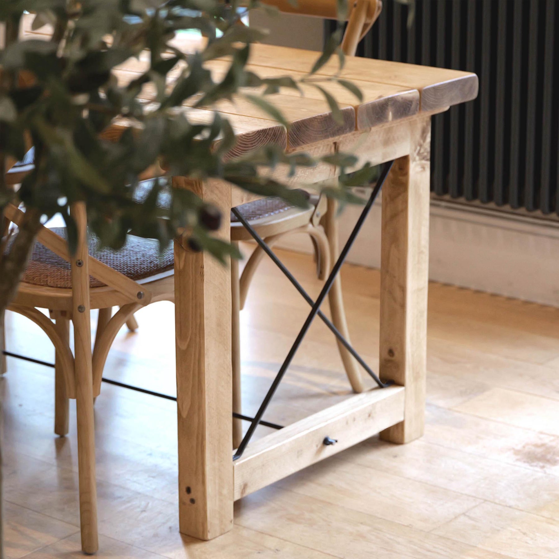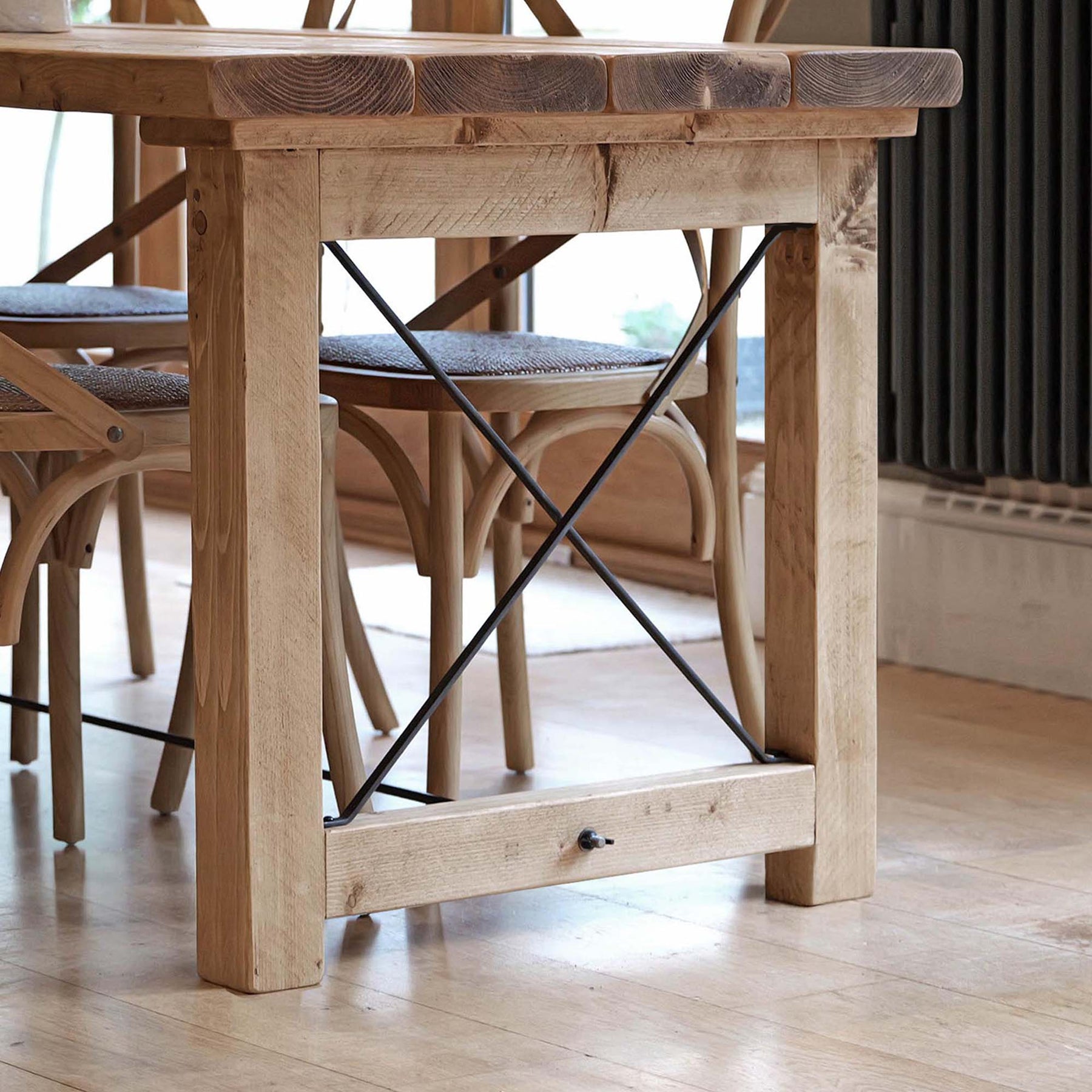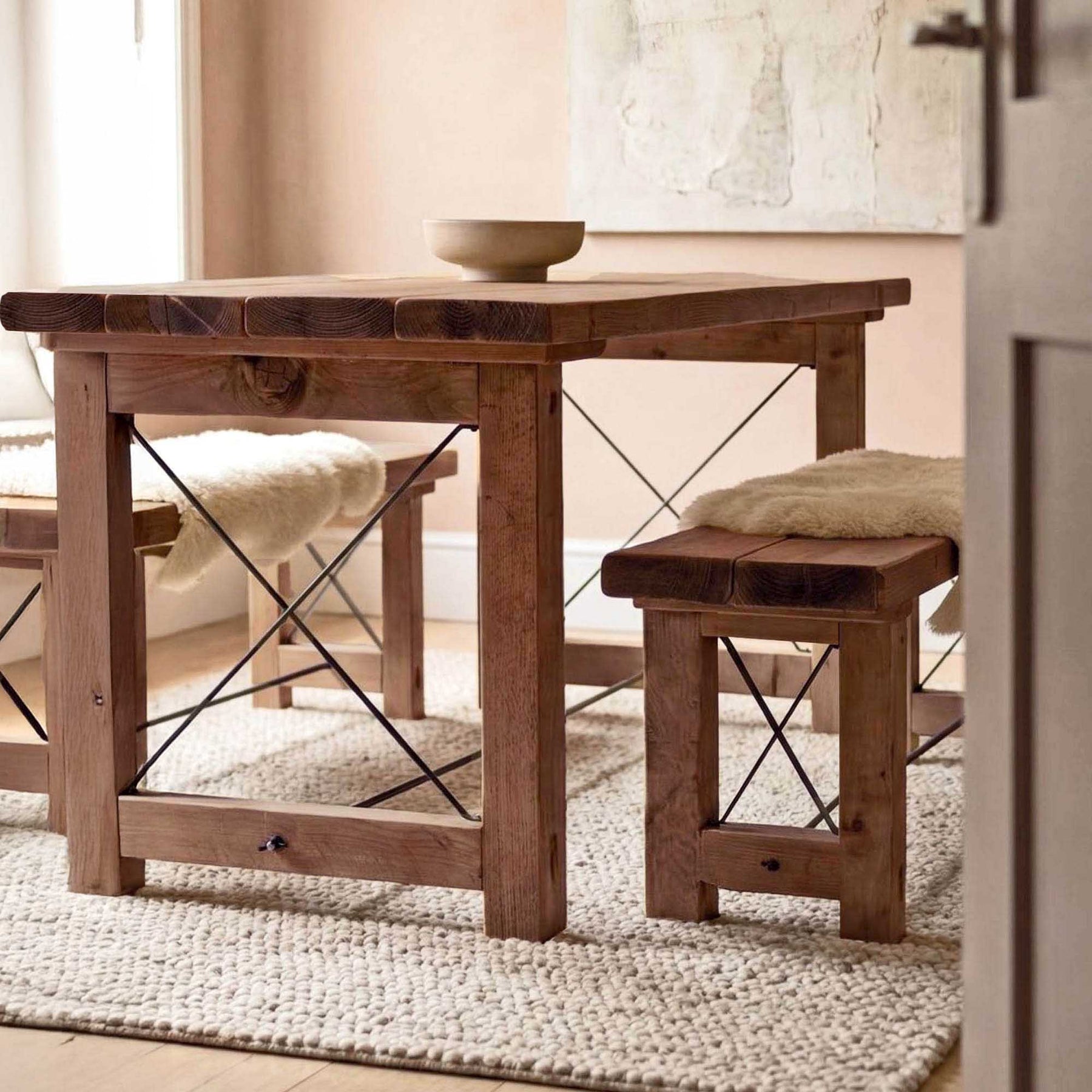 The solid timber leg design provides strength and stability while keeping the overall form clean and understated. Rustic details are left visible by choice, giving every piece a sense of individuality without compromising on balance or use.